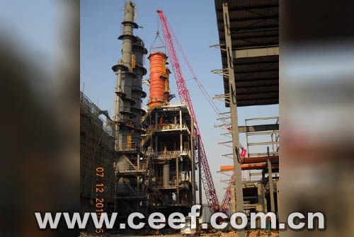 2010-12-09 近期,我公司承制完成了常州某大型化工廠25萬噸/年苯乙烯項目中的部分非標設備。這是公司在近年來容器類產品開發上取得的新突破,說明我公司在大型非標容器制作能力方面有了明顯提高。也為今后公司拓展容器類產品市場奠定了堅實的基礎。 該組產品共包括T1401預分餾塔、V—3100減壓塔回流槽等9 套設備。目前,設備已運抵用戶現場,正進入緊張地現場安裝階段。(圖為我公司設備安裝現場)